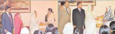 Prime Minister Sheikh Hasina on behalf of National Bank Limited (left) handing over cheques for Tk. 24 lac for 4th year to the families of five army officers held at a simple ceremony at Gono Bhaban in the city recently. The Prime Minister on behalf of NCC Bank also handed over another cheque worth Tk. 4.8 lac as yearly contribution for 4th year to Dr. Rowsan Ara Begum, wife of Lt. Col. Lutfur Rahman.