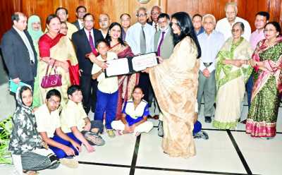 Rumana Sharif, Director of Pubali Bank Ltd, hands over a cheque for Tk 60 lakh to a student of Society for the Welfare of Autistic Children at a function at Pubali Bank head office recently.