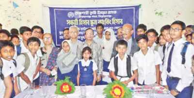 Md Mofazzal Hussain, Managing Director of Rajshahi Krishi Unnayan Bank (RAKUB), is seen along with school students at the opening of school banking account in Sirajganj on Thursday.