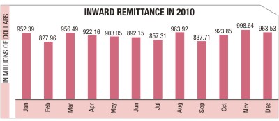 The remittance inflow was $10.99 billion last year, and $10.71 billion in 2009.