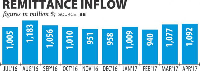 Some $1.09 billion flew in as remittance, up 1.9 percent from March but down 8.4 percent year-on-year, according to Bangladesh Bank statistics.