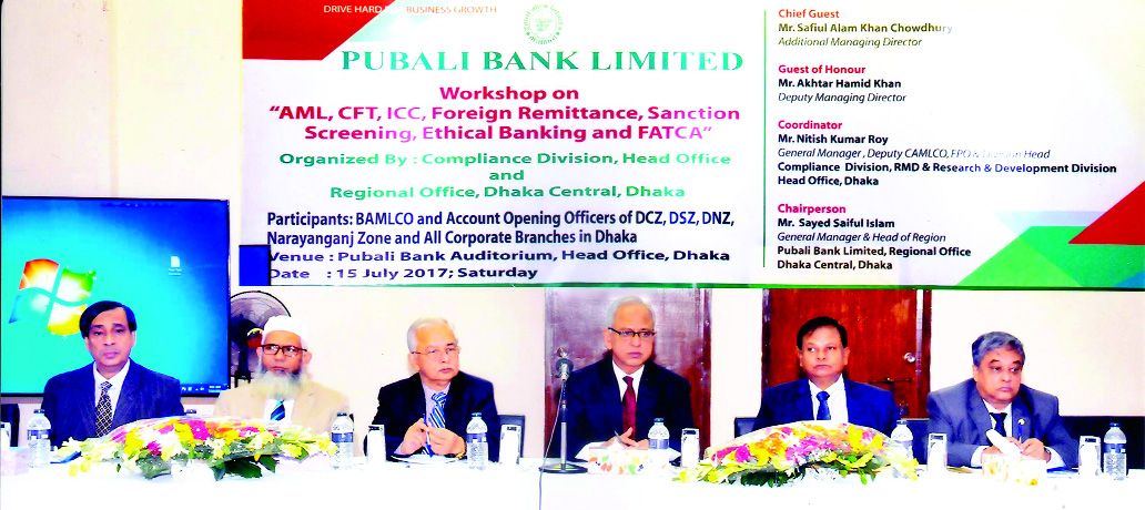 Safiul Alam Khan Chowdhury, Additional Managing Director of Pubali Bank Limited, inaugurating a workshop on "AML, ICC, Foreign Remittance, Sanction Screening, Ethical Banking and FATCA" at its head office recently. General Manager and RM of Dhaka Central