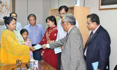 Quazi Baharul Islam, Chairman of Sonali Bank Limited, hands over a cheque to Poly Sarkar, the wife of late Dinesh Das at Sonali Bank head office in the city on Sunday.