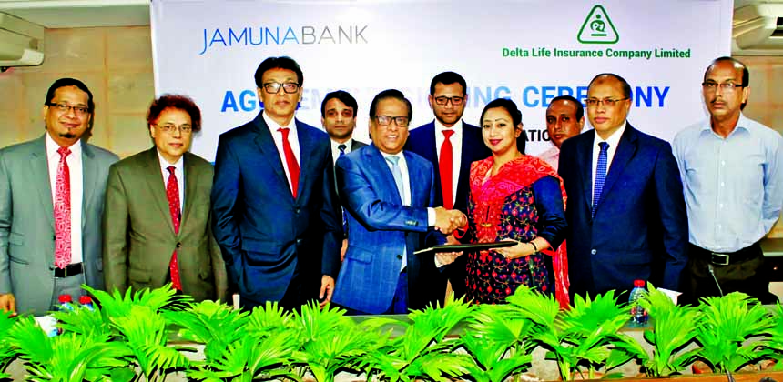 Shafiqul Alam, Managing Director of Jamuna Bank Limited and Adeeba Rahman, CEO (CC) of Delta Life Insurance Company Limited exchanging an agreement signing documents at the bank head office in the city recently. Under the deal, Jamuna Bank employees will
