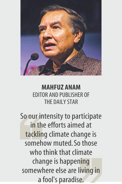 From left, CEO & Managing Director of Renata Ltd Syed S Kaiser Kabir, Founder and Coordinator of CRP Valerie A Taylor, DBL Managing Director MA Jabbar, Environment Minister Anwar Hossain Manju, Deputy Governor of Bangladesh Bank Shitangshu Kumar Sur Chowdhury, HSBC Bangladesh CEO Francois de Maricourt, Deputy CEO HSBC Bangladesh Mahbub Ur Rahman, General Manager of Ispahani Agro Ltd Fawzia Yasmeen, ACC Director General (admin) Muhammad Munir Chowdhury and Editor of Tarupallab Mokaram Hossain on stage at the 5th HSBC-The Daily Star Climate Awards ceremony at the Radisson Blu in the capital yesterday. Photo: Amran Hossain