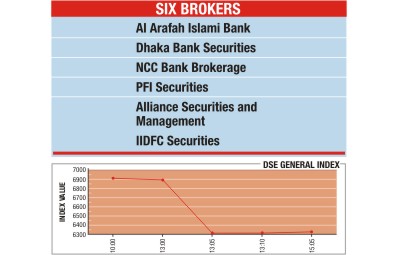 The suspended stockbrokers are Al Arafah Islami Bank, Dhaka Bank Securities, NCC Bank Brokerage, PFI Securities, Alliance Securities and Management and IIDFC Securities.