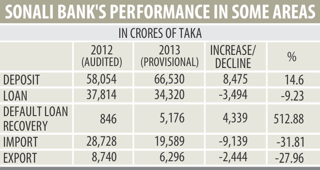 However, it was not all doom and gloom for the bank: not only did its default loans drop 23.48 percent in 2013, its recovery of default loans was at Tk 4,330 crore, which is 511 percent higher than in 2012. In 2013, the bank's default loans stood at Tk 9,638 crore.