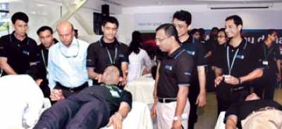 Head of Consumer Banking, Standard Chartered Bank Sandeep Bose looking at his colleagues donating blood during the programme of Standard Chartered Bank along with Bangladesh Red Crescent Society at the Bank's Head Office recently.