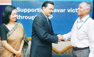 Abrar A Anwar, acting CEO of Standard Chartered Bangladesh, hands over a cheque worth Tk 2,900,000 to Md. Shafiq-ul Islam, Executive Director of CRP for the rehabilitation of the victims of Rana Plaza collapse at CRP at Savar recently.