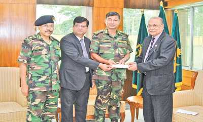 Standard Bank Chairman Kazi Akram Uddin Ahmed hands over a cheque worth Tk 30 lakh to Chief of Army Staff General Iqbal Karim Bhuiyan at a function in Dhaka recently as a donation to construct a new branch of Proyash.