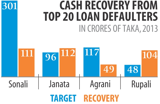 but managed only Tk 2,834 crore, which is 52.7 percent of the target, according to data from the central The recovery from top 20 loan defaulters, however, was better than in previous years: Sonali, Agrani, Janata and Rupali achieved 66 percent of their targets for 2013, whereas in previous years it was less than 12 Janata and Rupali were the high-achievers, hitting 117 percent and 217 percent of their targets respectively for retrieving bad loans from the top 20 defaulters. In comparison, Sonali and Agrani fared poorly, managing 37 percent and percent of their targets respectively.