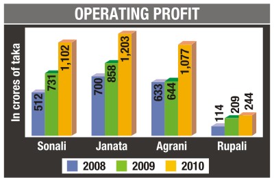 In 2010 four SCBs -- Sonali, Janata, Agrani and Rupali -- increased their average operational profit by 48 percent to Tk 3,626 crore, which was Tk 2,442 crore the previous year.