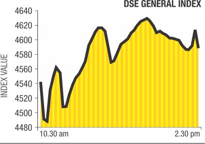 DGEN, the benchmark general index of Dhaka Stock Exchange, finished the day at 4,589.33 points, after surging of 44.93 points or 0.98 percent.