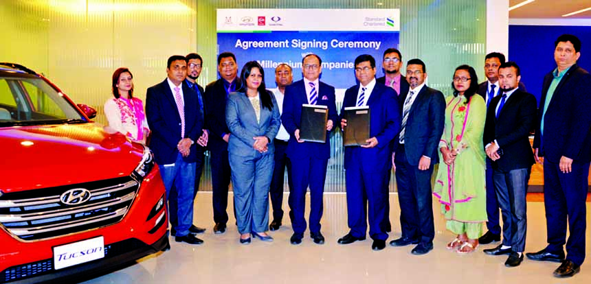 Syed Shakeel Ahmed, Managing Director, Hyundai Motors Bangladesh Ltd. and Makam E Mahmud Billah, Head Retail Products and Segments, Standard Chartered Bank (SCB) Bangladesh exchanging an MoU signing documents in the city recently. Under the deal, SCB has