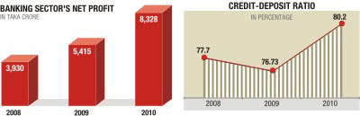 The banking sector's operating profits rose by over 47 percent to Tk 17,092 crore in 2010 from Tk 11,625 crore a year ago. Net profits also increased by nearly 54 percent to Tk 8,328 crore in 2010 from Tk 5,415 crore in the previous year.