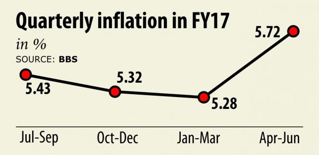 In the last quarter of fiscal 2016-17, inflation edged up about 44 basis points from the previous quarter to 5.72 percent, according to the data unveiled by Planning Minister AHM Mustafa Kamal yesterday.