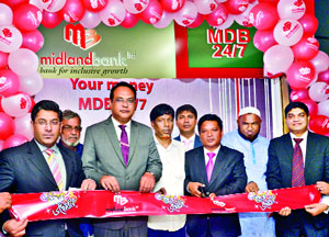 Mohammad Iqbal, EVP & head of Emerging Corporate and Special Programmes of Midland Bank( MDB), inaugurating ATM booth of MDB as the chief guest at Aganagar branch at Kearaniganj recently. Mostafizur Rahman, head of Cards, and Mir Rajib Faruk, AVP & head of Aganagar branch, were also present on the occasion