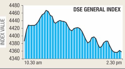 The benchmark DSE General Index (DGEN), the market’s main gauge, closed at 4548.89 with a slight fall of 16.82 points, chipping away gains of 134.21 points seen in the previous session. The broader All Shares Price Index (DSI) lost 8.78 points or 0.22 per cent to 3857. But the DSE-20 Index comprising blue chips shares gained 9.82 points or 0.27 per cent to 3528.86.