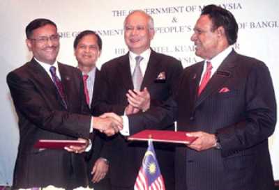 Communications Minister Obaidul Quader and S Samy Vellu, special envoy of Prime Minister's Department of Malaysia, shaking hands after signing a MoU in Kuala Lumpur Tuesday. Malaysian Prime Minister Mohd Najib Tun Razak is also seen behind them.