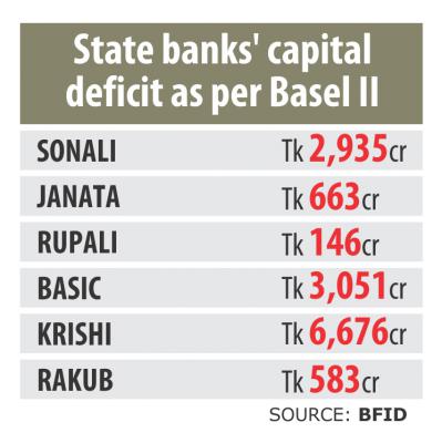 As per Basel II, Sonali Bank has Tk 2,935 crore of capital shortfall and BASIC Tk 3,051 crore, according to BFID statistics. Krishi Bank has a shortfall of Tk 6,676 crore, which is the highest.