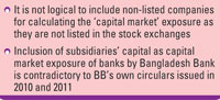 "Initially BB circulars said (DOS circular # 4, in 2010 and DOS circular # 4 in the year 2011) that the subsidiaries' capital will not be considered as capital market exposure of banks. But now Bangladesh Bank includes the subsidiaries' capital as capital market exposure of banks which is contradictory to BB's own circulars," an executive of another top brokerage house said.