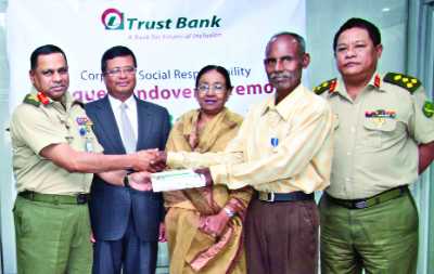 Maj Gen Ashraf Abdullah Yussuf and Vice Chairman of Trust Bank Limited, hands over a cheque to Md Abdur Rouf, Headmaster of Anandabagh Shishupalli Primary School in the city on Wednesday.