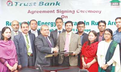 An agreement was signed between Trust Bank Limited and ARS–Bangladesh on Wednesday on “Renewable Energy Financing in Rural Areas”.