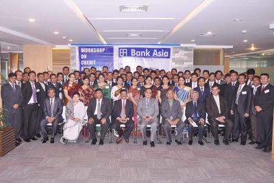 A Rouf Chowdhury, chairman of Bank Asia, poses with participants of a two-day workshop on credit appraisal system and green banking, at its concluding ceremony at the Bank 's corporate office in Dhaka on Sunday. Md Mehmood Husain, managing director, was also present.