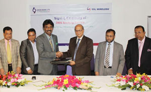 Md Abdul Hamid Miah, managing director of Union Bank Ltd, and Sayeeful Islam, managing director of SSL Wireless (Software Shop Limited), exchange documents after signing an agreement on offering SMS banking service to the customers of the bank in the city Sunday.