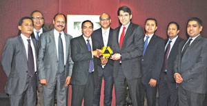 M Shahidul Islam, Additional Managing Director of United Commercial Bank Limited (UCBL) receiving the 'Gold Trade Award 2014' from Maumer Mesak, Relationship Manager, Financial Institutions, Commerzbank AG at a programme in presence of Mirza Mahmud Rafiqur Rahman, Additional Managing Director and Mohammad Shawkat Jamil, Deputy Managing Director of UCBL recently for maintaining 'excellent partnership' in Trade Finance in the year 2014.
